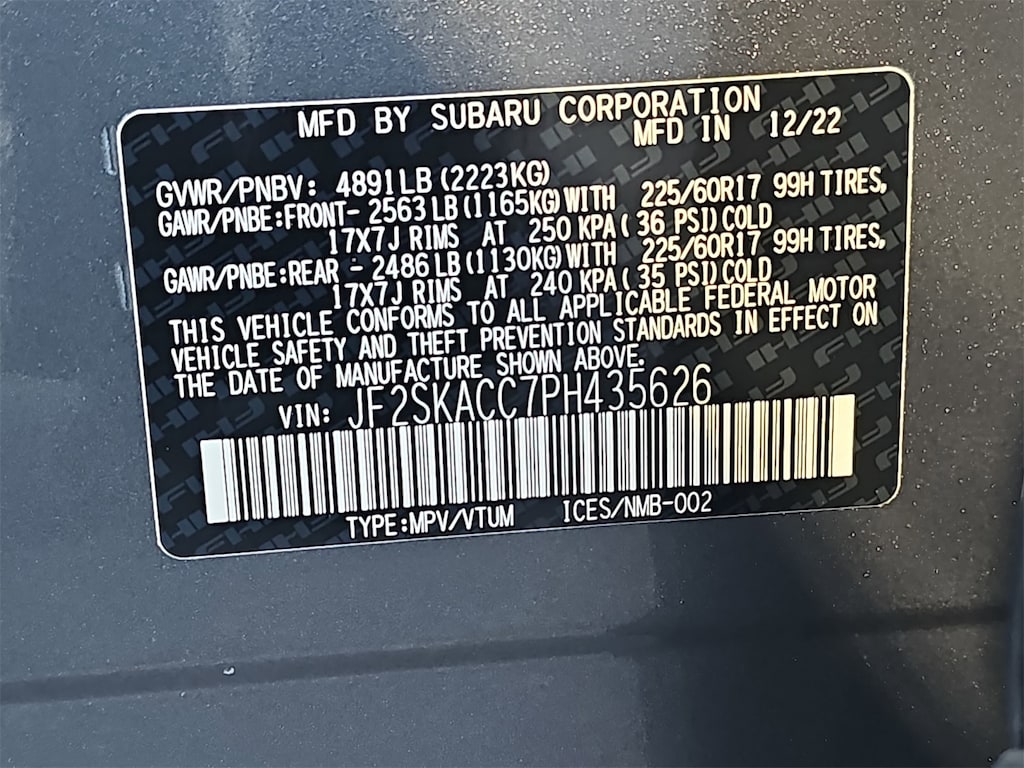 Certified, CLEAN CARFAX, WARRANTY!!!, ONE OWNER!!. Subaru Certified Pre-Owned Certified, 3.70 Axle Ratio, 4 Speakers, 4-Wheel Disc Brakes, ABS brakes, Air Conditioning, AM/FM radio: SiriusXM, Anti-whiplash front head restraints, Auto High-beam Headlights, Automatic temperature control, Brake assist, Bumpers: body-color, CD player, Cloth Upholstery, Driver door bin, Driver vanity mirror, Dual front impact airbags, Dual front side impact airbags, Electronic Stability Control, Exterior Parking Camera Rear, Four wheel independent suspension, Front anti-roll bar, Front Bucket Seats, Front Center Armrest, Front reading lights, Fully automatic headlights, Illuminated entry, Knee airbag, Low tire pressure warning, Occupant sensing airbag, Outside temperature display, Overhead airbag, Overhead console, Panic alarm, Passenger door bin, Passenger vanity mirror, Power door mirrors, Power steering, Power windows, Radio data system, Radio: Subaru Starlink 6.5" Multimedia Plus System, Rear anti-roll bar, Rear window defroster, Rear window wiper, Remote keyless entry, Security system, Speed control, Speed-sensing steering, Split folding rear seat, STARLINK/Apple CarPlay/Android Auto, Steering wheel mounted audio controls, Tachometer, Telescoping steering wheel, Tilt steering wheel, Traction control, Trip computer, and Variably intermittent wipers.
