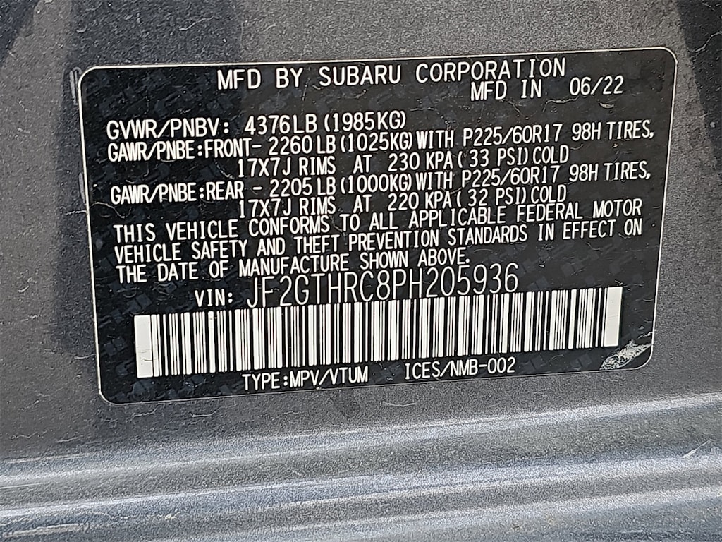 Certified, CLEAN CARFAX, WARRANTY!!!, ONE OWNER!!. Subaru Certified Pre-Owned Certified, 3.70 Axle Ratio, 4-Wheel Disc Brakes, 6 Speakers, ABS brakes, Air Conditioning, Alloy wheels, AM/FM radio: SiriusXM, Anti-whiplash front head restraints, Automatic temperature control, Brake assist, Bumpers: body-color, CD player, Driver door bin, Driver vanity mirror, Dual front impact airbags, Dual front side impact airbags, Electronic Stability Control, Emergency communication system: STARLINK Safety and Security (Subscription Required), Exterior Parking Camera Rear, Four wheel independent suspension, Front anti-roll bar, Front Bucket Seats, Front Center Armrest, Front fog lights, Front reading lights, Fully automatic headlights, Heated door mirrors, Heated Front Bucket Seats, Heated front seats, Illuminated entry, Knee airbag, Leather Shift Knob, Low tire pressure warning, Occupant sensing airbag, Outside temperature display, Overhead airbag, Overhead console, Panic alarm, Passenger door bin, Passenger vanity mirror, Power door mirrors, Power steering, Power windows, Radio data system, Radio: Subaru STARLINK 6.5" Multimedia Plus System, Rear anti-roll bar, Rear window defroster, Rear window wiper, Remote keyless entry, Security system, Speed control, Speed-sensing steering, Split folding rear seat, Spoiler, STARLINK/Apple CarPlay/Android Auto, StarTex Upholstery, Steering wheel mounted audio controls, Tachometer, Telescoping steering wheel, Tilt steering wheel, Traction control, Trip computer, Turn signal indicator mirrors, Variably intermittent wipers, and Wheels: 17" x 7.0J Alum Alloy Dark Gray Met Finish.