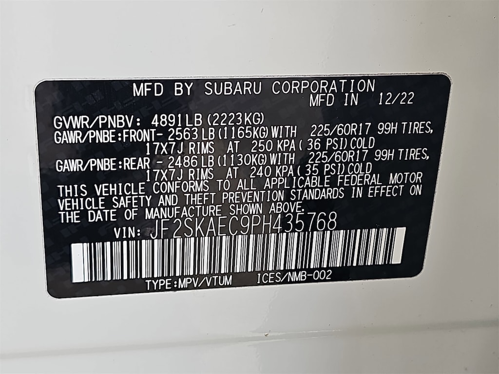 Certified, Sunroof/Moonroof, WARRANTY!!!, ONE OWNER!!. Blind Spot Detection w/RCTA & Power Rear Gate (Blind-Spot Detection (BSD), Driver's Seatback Divided Pocket, Dual USB Charge Ports, EyeSight System, Multi-Function High Grade Display, and Power Rear Gate), Subaru Certified Pre-Owned Certified, 3.70 Axle Ratio, 4-Wheel Disc Brakes, 6 Speakers, ABS brakes, Air Conditioning, Alloy wheels, AM/FM radio: SiriusXM, Anti-whiplash front head restraints, Auto High-beam Headlights, Automatic temperature control, Brake assist, Bumpers: body-color, CD player, Driver door bin, Driver vanity mirror, Dual front impact airbags, Dual front side impact airbags, Electronic Stability Control, Emergency communication system: STARLINK Safety and Security (Subscription Required), Exterior Parking Camera Rear, Four wheel independent suspension, Front anti-roll bar, Front Bucket Seats, Front Center Armrest, Front fog lights, Front reading lights, Fully automatic headlights, Heated door mirrors, Heated Front Bucket Seats, Heated front seats, Illuminated entry, Knee airbag, Low tire pressure warning, Occupant sensing airbag, Outside temperature display, Overhead airbag, Overhead console, Panic alarm, Passenger door bin, Passenger vanity mirror, Power door mirrors, Power driver seat, Power moonroof: Panoramic, Power steering, Power windows, Premium Cloth Upholstery, Radio data system, Radio: Subaru Starlink 6.5" Multimedia Plus System, Rear anti-roll bar, Rear seat center armrest, Rear window defroster, Rear window wiper, Remote keyless entry, Roof rack: rails only, Security system, Speed control, Speed-sensing steering, Split folding rear seat, Spoiler, STARLINK/Apple CarPlay/Android Auto, Steering wheel mounted audio controls, Tachometer, Telescoping steering wheel, Tilt steering wheel, Traction control, Trip computer, Variably intermittent wipers, and Wheels: 17" x 7.0 J Black Machine Finish Alloy.